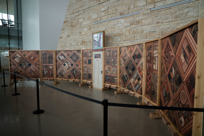 “The piece is inspired by a woven blanket; it is a huge, large-scale piece of artwork that connects items that have been reclaimed from government buildings, churches, homes, traditional and cultural pieces from across Canada, and residential schools.”