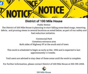The work is expected to last one to three weeks in Centennial Park, the cemetery entrance area, and both sides of Highway 97 at the south end of 100 Mile House.