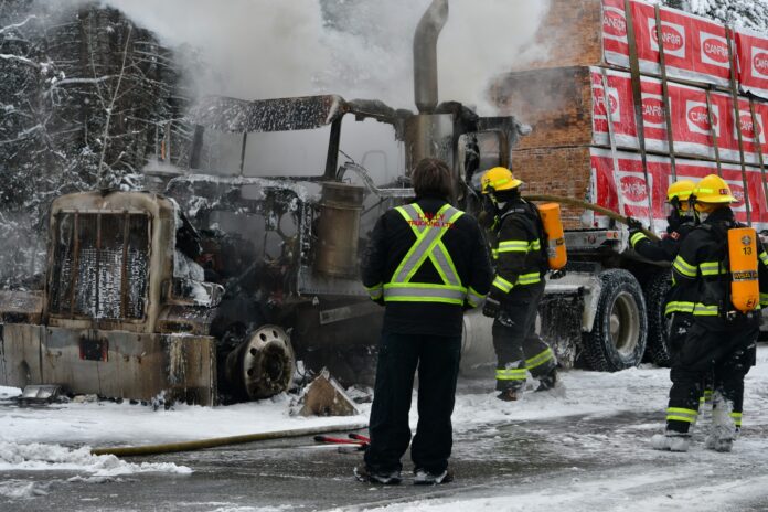 “The truck is a complete loss. The load, we managed to save that. There was just some slight charring and some burning of the plastic of the lumber wrap on the A-box. Besides that the load was save.”
